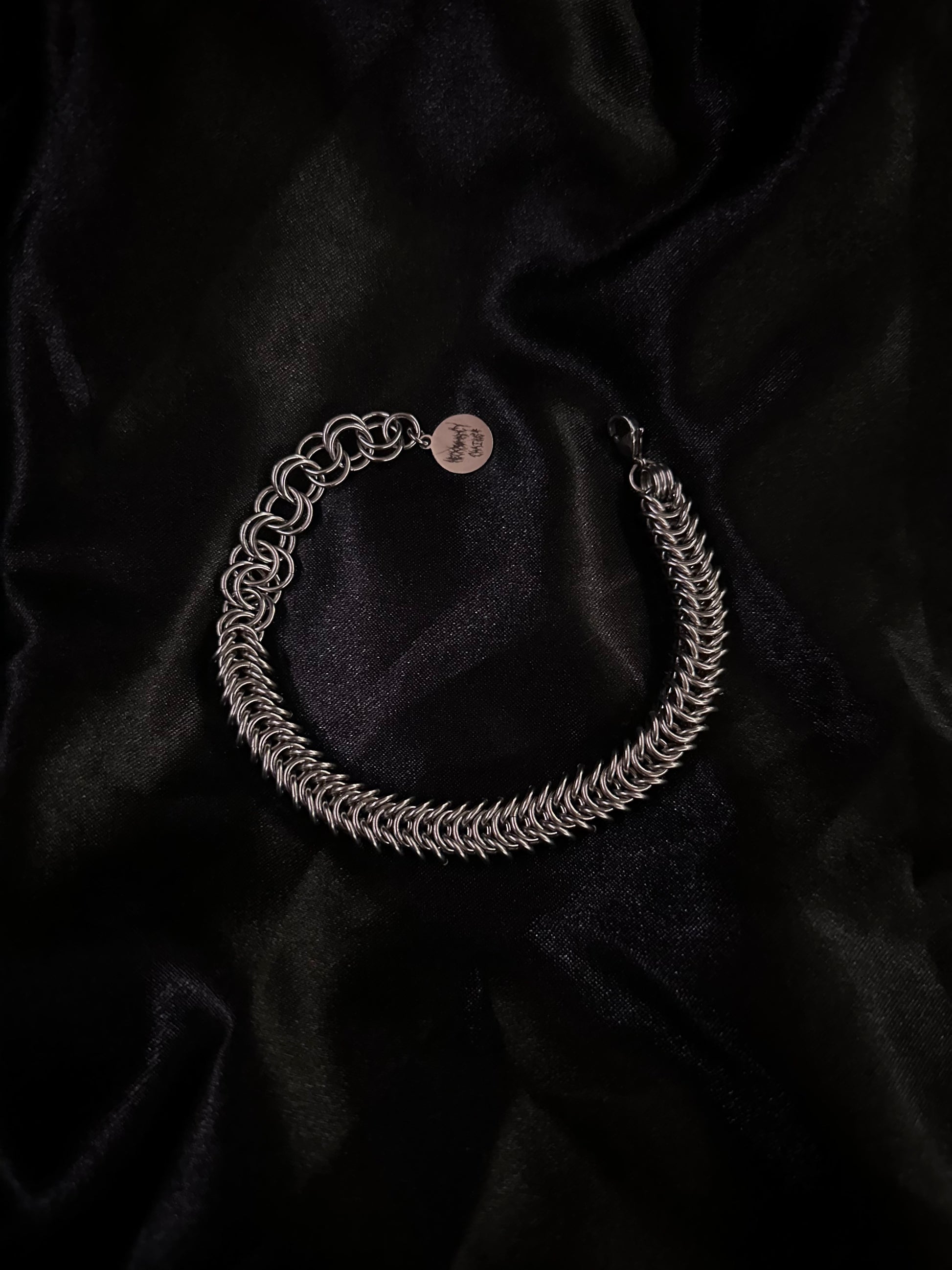 Embrace your dark side with this chunky handwoven stainless steel chainmail bracelet. This bracelet includes a stainless steel lobster clasp, up to 1/2" of adjustable length, and a logo tag. Its durable design is perfect for 24/7 wear and can even withstand water. Stand out in style with the Baron Blood Bracelet.