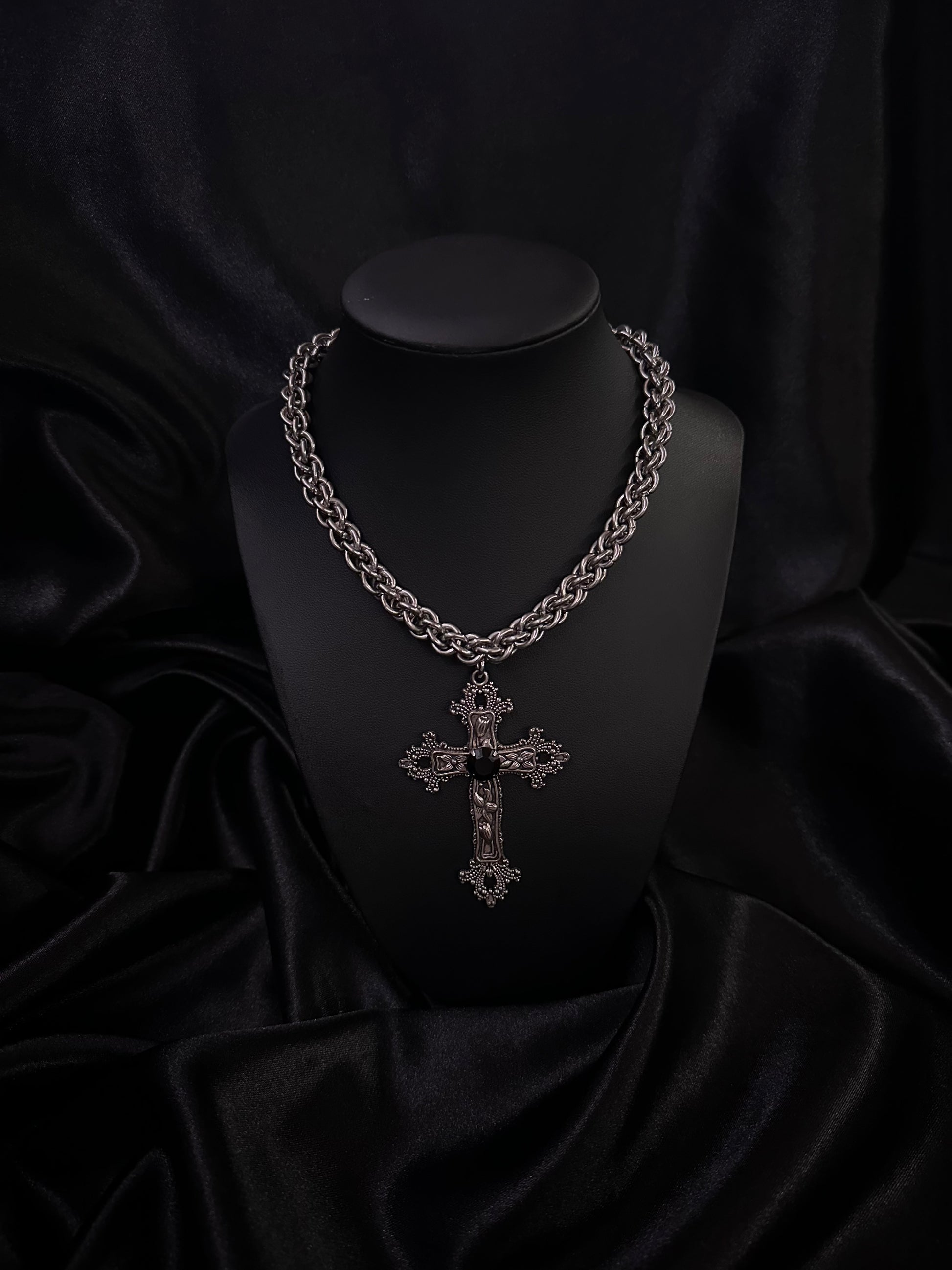 Introducing the Eris Necklace - a handwoven chainmail necklace including large cross pendant featuring a striking black gem, a 2" nickel-plated clasp, up to 1.5" of adjustable length, and a logo tag. Made from sturdy stainless steel, this necklace adds a touch of gothic elegance to any outfit. Perfect for those looking to make a bold statement.